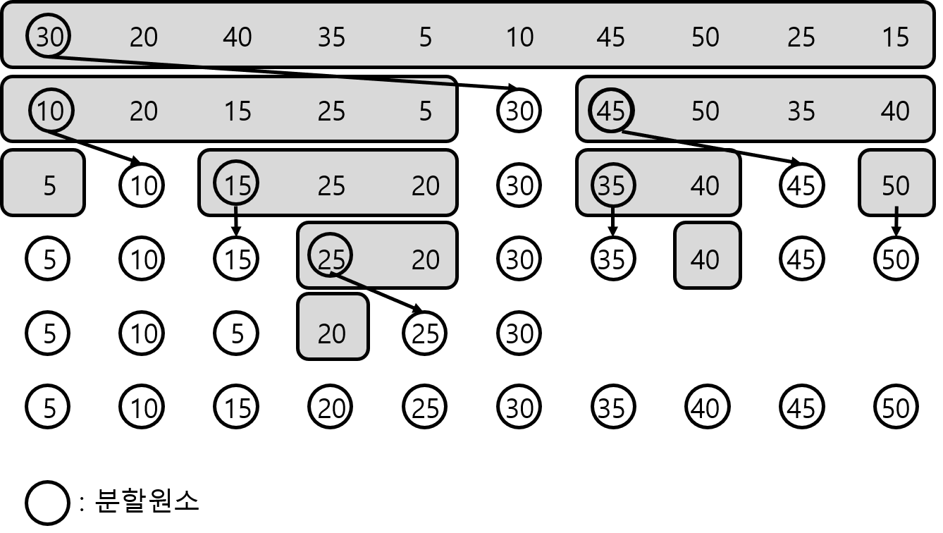 - 분할 원소의 왼쪽에 있는 모든 키들은 분할 원소보다 작고, 오른쪽에 있는 모든 키들은 분할 원소보다 크다는 조건을 만족한다.