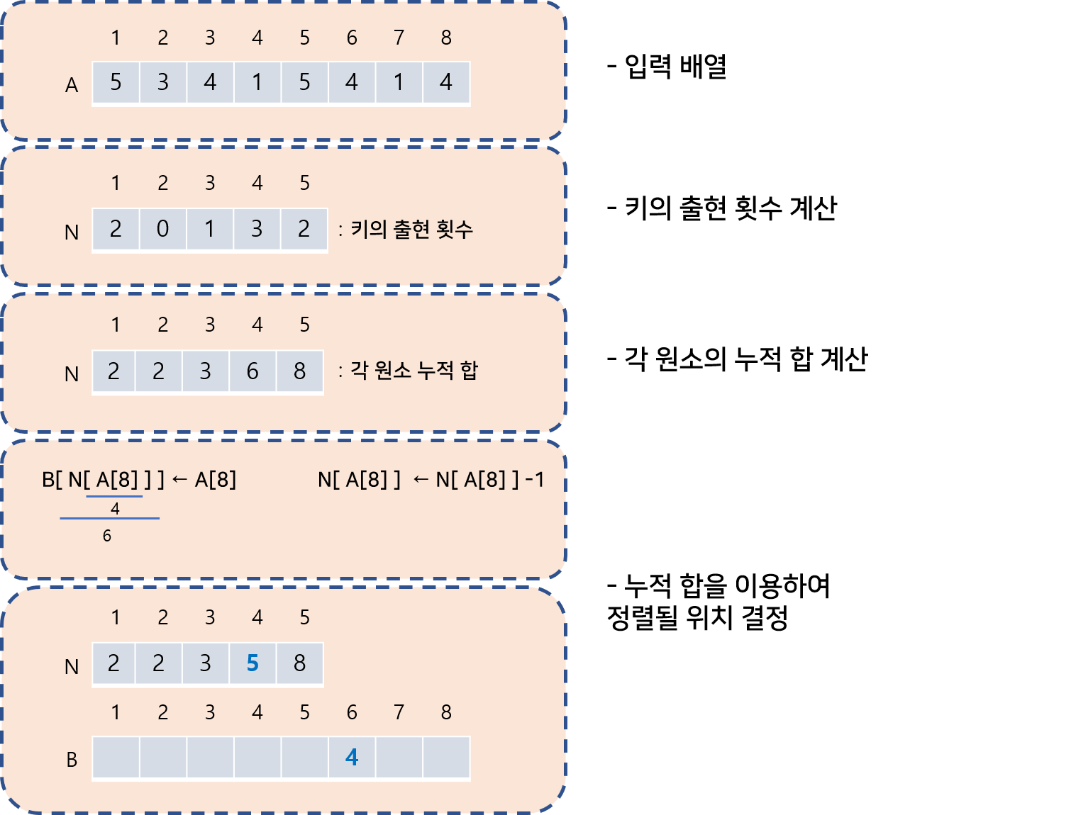 어떤 입력 키 x의 정렬 위치는 x보다 작은 키가 몇 개나 입력에 나타나는지를 알면 결정할 수 있다.