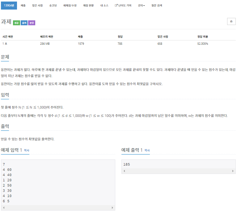 - 언제 어떠한 과제를 할 지를 저장하는 array에 가장 높은 점수부터 해당 마감일에 과제를 완료하는 것으로 가정하여 array에 저장한다.