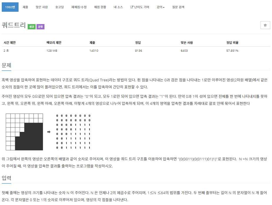 - 입력은 항상 2의 제곱수로 이루어지기 때문에 1, 4, 8, 16... 등 크기가 1인 가장 하위 subProblem에서 return한다고 하였을 때 모든 입력을 4개의 subProblem으로 나누어 해결할 수 있다.