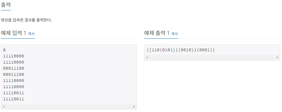 첫째 줄에는 영상의 크기를 나타내는 숫자 N 이 주어진다. N 은 언제나 2의 제곱수로 주어지며, 1≤N ≤64의 범위를 가진다. 두 번째 줄부터는 길이 N 의 문자열이 N 개 들어온다. 각 문자열은 0 또는