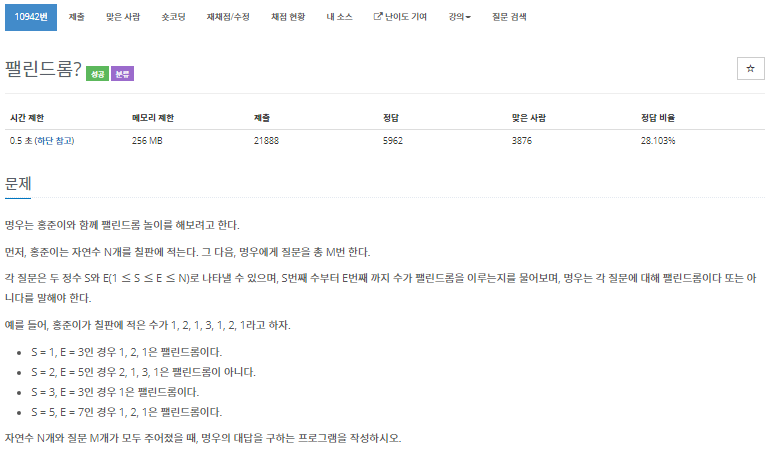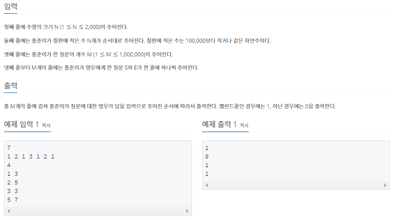 칠판에 적혀 있는 숫자들을 arr 에 저장하고 2차원 배열 dp 를 통해 ( dp[s][e] ( 질문이 S E 일 때의 결과) ) 결과들을 저장하여 이미 계산이 이뤄진 경우의 수를 반복 계산하지 않도록 한다.